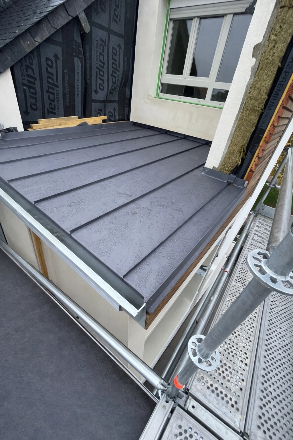 Toitures Gemmoises réalise la pose de couverture PLX en joint debout, une solution haut de gamme idéale pour les projets contemporains comme pour les rénovations soignées. La photo ci-jointe illustre une réalisation avec des joints debout réguliers et des finitions nettes, caractéristiques d’une mise en œuvre précise.